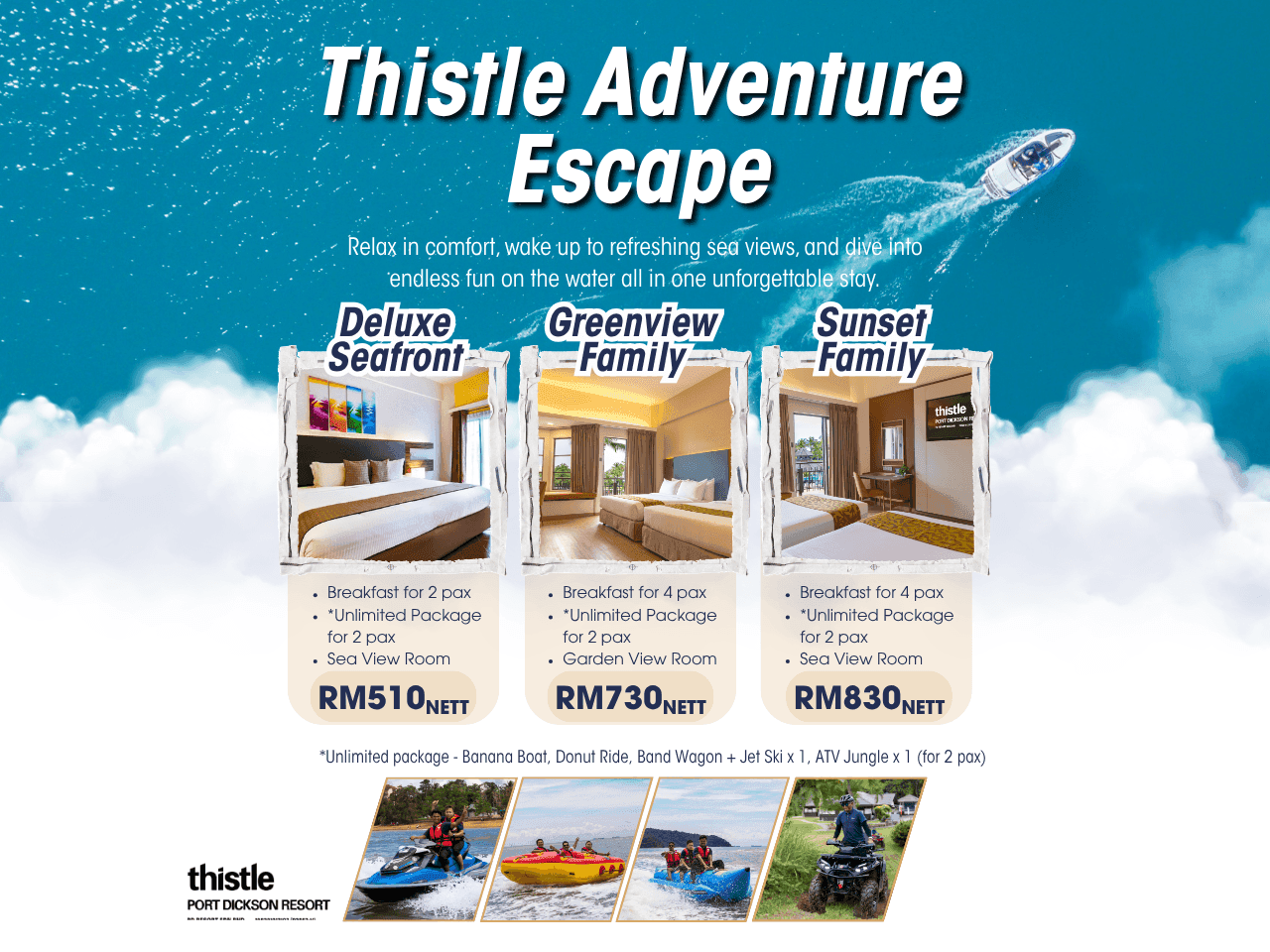 Check out our Family Room, which comes with breakfast and hi-tea for two adults and childrens. You can also pick between a quick 5-minute jet ski or a fun 7-minute banana boat ride.